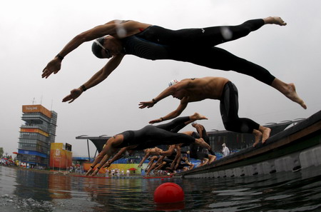 Competitors dive into the water to start the men's marathon 10km swimming event at the Shunyi Olympic Rowing-Canoeing Park during the Beijing 2008 Olympic Games August 21, 2008.[Agencies]