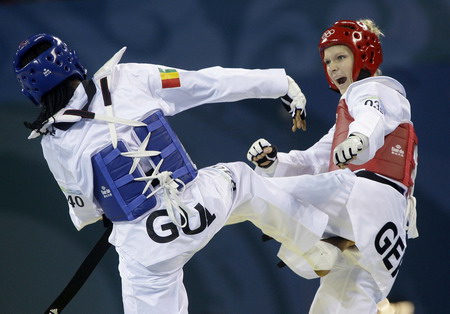 Mariama Dalanda Barry of Guinea (blue) and Helena Fromm of Germany fight during their women's -67kg preliminary round of 16 taekwondo match at the Beijing 2008 Olympic Games, August 22, 2008.[Agencies]