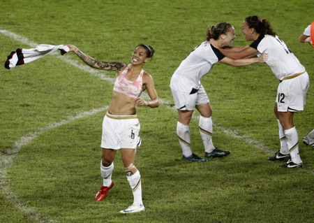 Natasha Kai of the U.S. (R) celebrates with teammates after winning their women's final soccer match against Brazil at the Beijing 2008 Olympic Games August 21, 2008.[Agencies]
