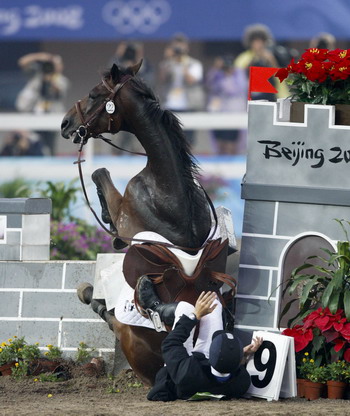 David Svoboda of Czech Republic falls with his horse HunHun during the men's riding show jumping event of the modern pentathlon competition at the Beijing 2008 Olympic Games, August 21, 2008.[Agencies]