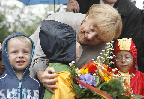 German Chancellor Angela Merkel chats with children during a visit at a kindergarden in the western city of Hiddenhausen near Bielefeld August 22, 2008. The visit at the kindergarden is part of the Chancellors summer journey through Germany. [Agencies]