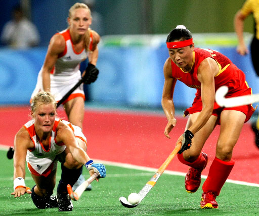 China's Chunling Tang (R) and the Netherlands' Sophie Polkamp (L) vie during their women's final hockey match at the Olympic Green Hockey Stadium in Beijing on August 22, 2008.[Agencies]