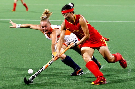 Tang Chunling of China (R) and Minke Booij of the Netherlands fight for the ball during their women's gold medal hockey match at the Beijing 2008 Olympic Games August 22, 2008.[Agencies]