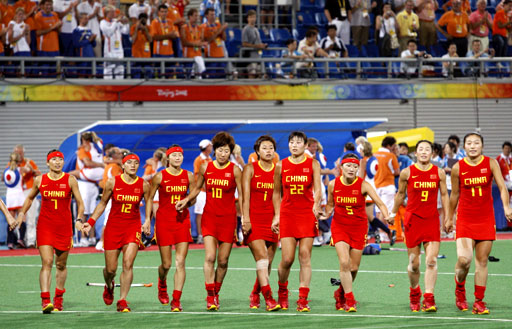 The China team react to their loss to the Netherlands in their women's gold medal hockey match at the Beijing 2008 Olympic Games August 22, 2008.[Agencies]