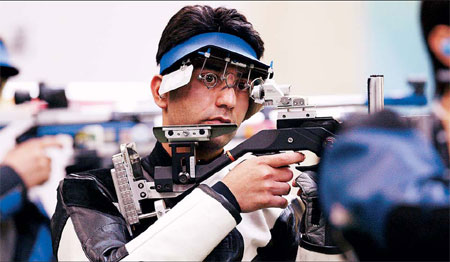 India's gold medalist Abhinav Bindra pauses between shots during the men's 10m air rifle final in Beijing on Aug 11. AP