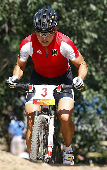 Sabine Spitz of Germany competes in the women's cross-country mountain bike cycling competition at the Beijing 2008 Olympic Games August 23, 2008. [Agencies]