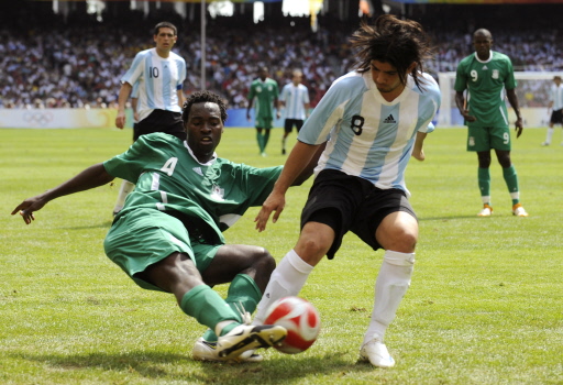 Nigerian defender Onyekachi Apam (L) and Argentinian midfielder Ever Banega fight for the ball during the men's Olympic football final Argentina vs. Nigeria at the national stadium in Beijing during the 2008 Beijing Olympic games on August 23, 2008. Argentina won 1-0. [Agencies]