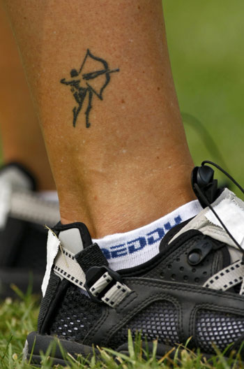 A tattoo is seen near the ankle of Natalia Valeeva of Italy as she competes in the women's archery individual ranking round at the Beijing 2008 Olympic Games August 9, 2008.[Agencies]