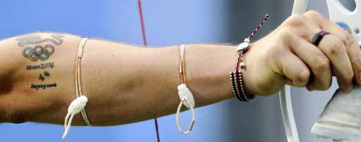 A tattoo of the Olympic rings is seen on the arm of archer Laurence Godfrey of Britain as he shoots during the men's team competition at the Beijing 2008 Olympic Games on August 11, 2008.[Agencies]
