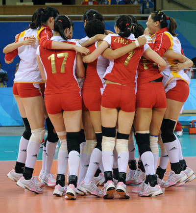 China's players celebrate after beating Cuba in the women's volleyball bronze medal match in the 2008 Beijing Olympic Games in Beijing on August 23, 2008. China won 3:1.[Agencies]