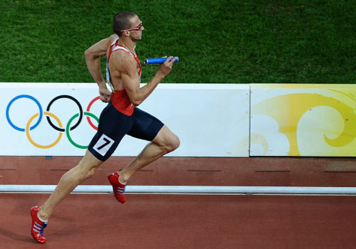 Newly-crowned 400m champion LaShawn Merritt ran the first leg. The second was Angelo Taylor, twice Olympic champion in 2004 and 2008 in the 400m hurdles, and the third was David Neville, the 400m bronze winner and the anchor leg was run by Jeremy Wariner, the Athens champion and silver winner behind Merritt.