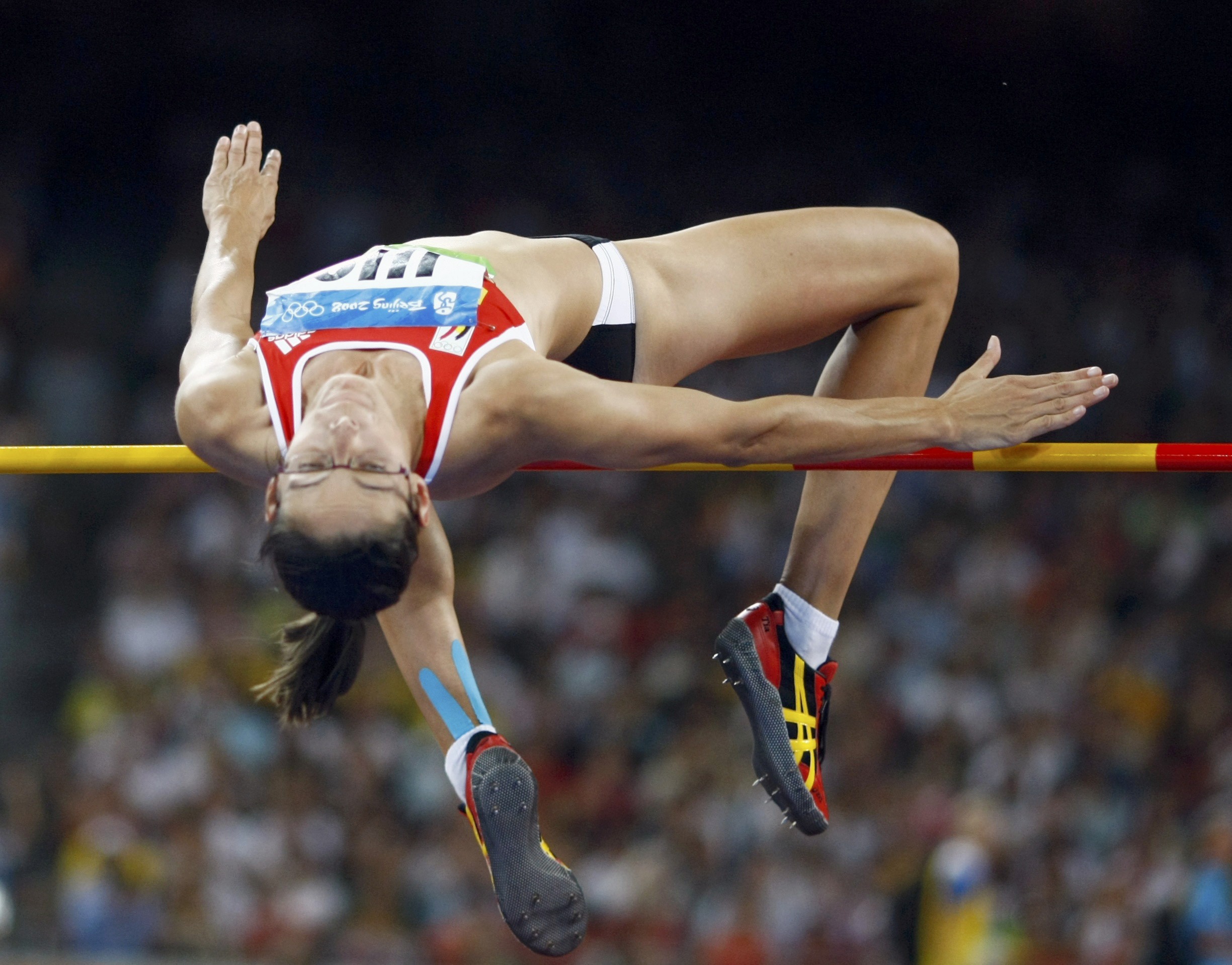 | Tia Hellebaut of Belgium competes during the women's high jump final of the athletics competition in the National Stadium at the Beijing 2008 Olympic Games August 23, 2008. [Agencies] |