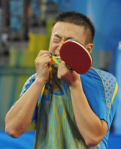 Gold medalist Ma Lin of China celebrates after winning the men's table tennis singles competition at the 2008 Beijing Olympic Games on August 23, 2008. China's Ma Lin won table tennis gold in the men's singles on Saturday, defeating teammate Wang Hao in the final. [Agencies]