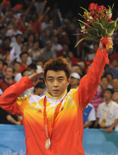 Silver medalist Wang Hao of China poses for pictures on the podium after competing in the men's table tennis singles competition at the 2008 Beijing Olympic Games on August 23, 2008.[Agencies]
