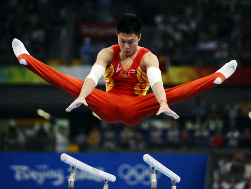 China's Li Xiaopeng competes in the men's parrallel bars final of the artistic gymnastics event of the Beijing 2008 Olympic Games in Beijing on August 19, 2008. China's Li Xiaopeng won the gold, South Korea's Yoo Wonchul the silver and Uzbekistan's Anton Fokin the bronze. [Agencies]