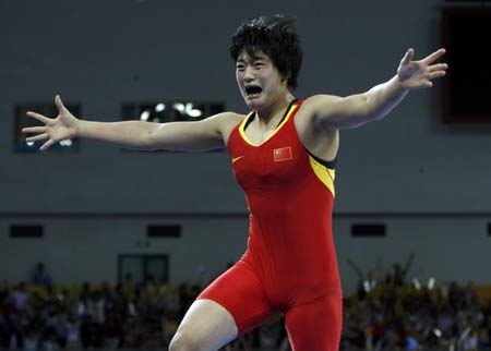 Wang Jiao of China celebrates after defeating Stanka Zlateva of Bulgaria in their 72 kg women's freestyle wrestling final bout at the Beijing 2008 Olympic Games August 17, 2008. [Agencies]