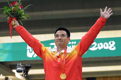 Qiu Jian of China celebrates on the podium of the 2008 Beijing Olympic Games men's 50m Rifle 3 positions shooting event on August 17, 2008 at the Beijing Shooting Hall. [Agencies]