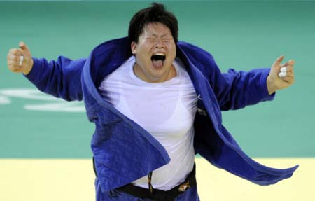 China's Tong Wen reacts after defeating Japan's Maki Tsukada (not pictured) in their women's +78 kgs judo match of the 2008 Beijing Olympic Games on August 15, 2008 in Beijing. Tong won the gold. [Agencies]