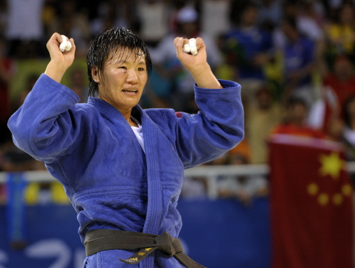 China's Yang Xiuli celebrates after defeating Cuba's Yalennis Castillo (unseen) in their women's -78kgjudo match of the 2008 Beijing Olympic Games on August 14, 2008 in Beijing. [Agencies]
