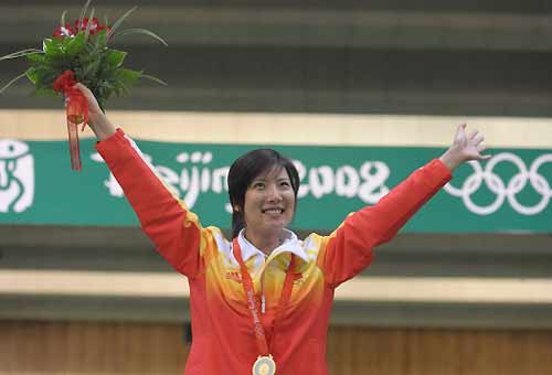 China's Du Li celebrates on the podium after winning the Gold medal in the 2008 Beijing Olympic Games women's 50m rifle 3 positions shooting event on August 14, 2008 at the Beijing Shooting Hall. This is the 19th gold medal of China.[Agencies]