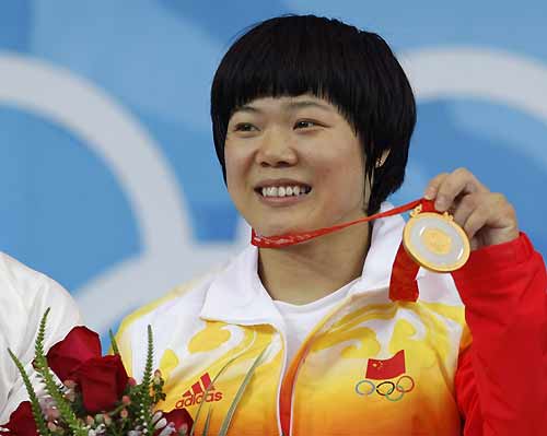 Liu Chunhong of China poses with her gold medal in the women's 69kg weightlifting competition at the Beijing 2008 Olympic Games August 13, 2008. This is the 17th gold medal of China. [Agencies]