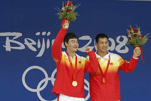 Wang Feng and Qin Kai of China celebrate after the men's synchronised 3m springboard diving final at the 2008 Beijing Olympics, August 13, 2008.This is the 16th gold medal of China. [Agencies]