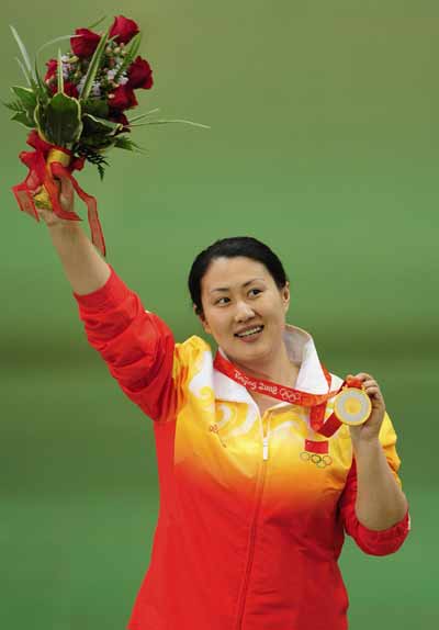 Gold medallist Chen Ying of China celebrates winning the women's 25m pistol shooting competition at the Beijing 2008 Olympic Games
