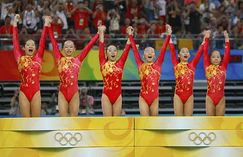 Members of the Chinese team celebrate after winning the women's team artistic gymnastics gold medal at the Beijing 2008 Olympic Games August 13, 2008.This is the 14th gold medal of China. [Agencies]