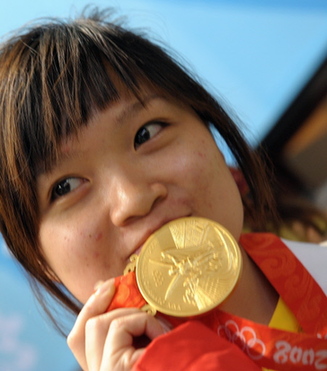 Guo Wenjun of China celebrates on the podium after winning the gold medal in the women's 10m Air Pistol category at the 2008 Beijing Olympic Games on August 10, 2008 at the Beijing Shooting Hall. Natalia Paderina of Russia won the silver medal and Nino Salukvadze of Georgia claimed bronze. [Agencies]