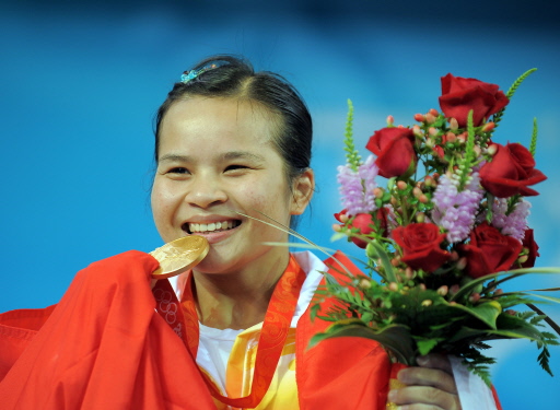 China's Chen Xiexia celebrates after winning the gold medal in the women's 48kg weightlifting event of the 2008 Beijing Olympic Games at the Beijing University of Aeronautics and Astronautics Gymnasium on August 9, 2008. [Agencies]