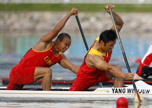 Meng Guanliang (R) and Yang Wenjun of China paddle to win during the canoe double (C2) 500m men final at the Beijing 2008 Olympic Games August 23, 2008. [Agencies]