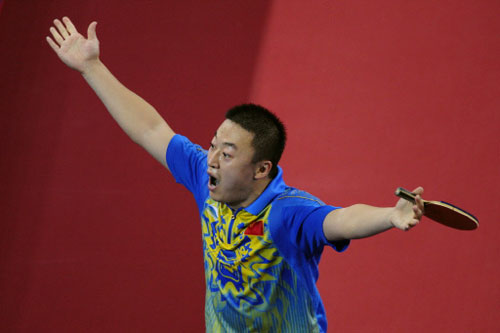 Ma Lin of China jubilates after defeating Wang Hao of China during the gold medal match in their men's table tennis singles final match at the 2008 Beijing Olympic Games on August 23, 2008.[ Agencies]