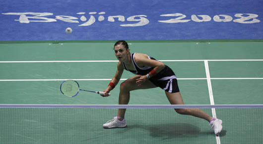 Anna Rice of Canada eyes the shuttlecock during their women's singles round of 32 badminton match against Jeannine Cicognini of Switzerland at the Beijing 2008 Olympic Games, August 10, 2008. [Agencies]