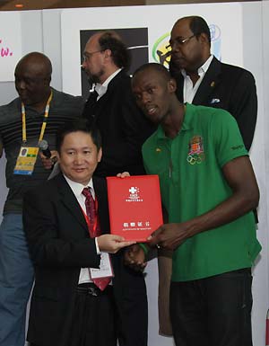 Liu Xuanguo (L front), vice general secretary of the Chinese Red Cross Foundation (CRCF), presents the certificate of donation to Jamaican athlete Usain Bolt (R front) during a donation ceremony in Beijing, capital of China, Aug. 23, 2008. Usain Bolt, who won three gold medals in the men's 100m, men's 200m, and men's 4x100m relay competitions of the Beijing 2008 Olympic Games, donates US$50,000 through the CRCF to the children in the earthquake-hit areas of China on Saturday, and invites six earthquake-affected children to travel to Jamaica.[Xinhua]