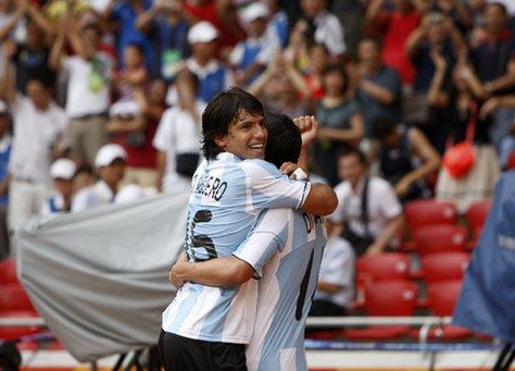 Argentina's Angel Di Maria (R) celebrates his goal against Nigeria with team mate Sergio Aguero during the men's gold medal soccer match at the Beijing 2008 Olympic Games, August 23, 2008. [Agencies]