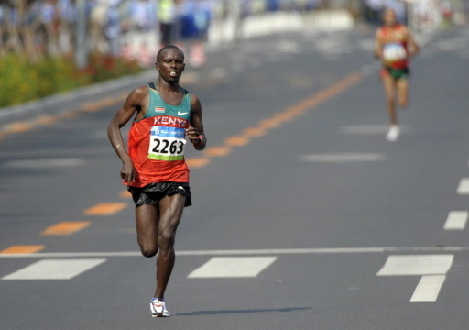 Kenya's Samuel Kamau Wansiru (L) runs ahead of Jaouad Gharib of Morocco (R) during the 2008 Beijing Olympic Games men's marathon competition near the Tian'an men Square in Beijing on August 24, 2008. Wansiru won the competition. [Agencies]