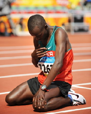 Kenya's Samuel Kamau Wansiru reacts after winning the men's marathon at the "Bird's Nest" National Stadium during the 2008 Beijing Olympic Games on August 24, 2008. Wansiru won the men's marathon title, giving Kenya their first ever Olympic gold in the event. The 21-year-old timed 2hr 06:32, breaking the 24-year-old Olympic record set by Carlos Lopes. Morocco's Jaouad Gharib (2hr 07:16) took silver and Ethiopia's Tsegay Kebede of Ethiopia the bronze (2hr 10:00). [Agencies]