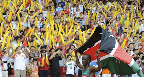 Samuel Kamau Wansiru of Kenya holds his national flag after winning the men's marathon in the athletics competition at the National Stadium during the Beijing 2008 Olympic Games August 24, 2008. [Agencies]
