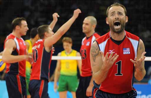 US player Lloy Ball celebrates a point against Brazil during the men's volleyball gold medal match in the 2008 Beijing Olympic Games in Beijing on August 24, 2008. [Agencies]