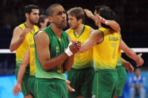 Brazil's Sergio Santos (C) and teammates celebrate a point against the US during the men's volleyball gold medal math in the 2008 Beijing Olympic Games in Beijing on August 24, 2008. [Agencies]