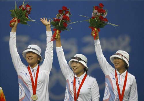 Park Sung-hyun (L), Yun Ok-hee (C) and Joo Hyun-jung of South Korea wave to the crowd after beating China in their women's team archery gold medal match at the Beijing 2008 Olympic Games August 10, 2008.[Agencies]