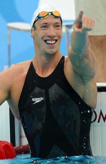 France's Alain Bernard claims victory in the men's 100m freestyle swimming semifinal at the National Aquatics Center during the 2008 Beijing Olympic Games on August 13, 2008 in Beijing. Bernard set a new world record time of 47.20 in the first heat, which was broken by Australia's Eamon Sullivan in the next heat with a time of 47.05.[Agencies]