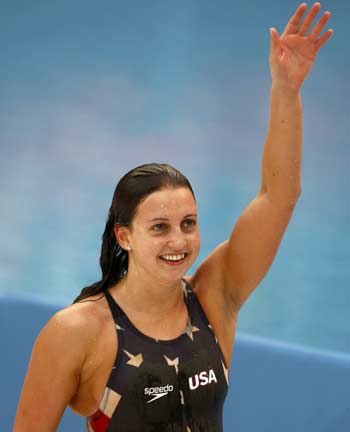 Rebecca Soni of the U.S. waves after winning the gold medal and setting a world record in the women's 200m breaststroke swimming final at the National Aquatics Center during the 2008 Beijing Olympics, August 15, 2008.[Agencies]