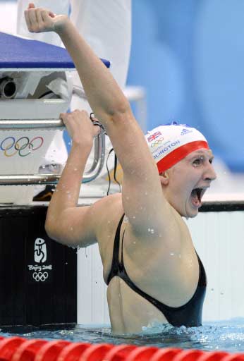 Rebecca Adlington of Great Britain reacts after the women's 800m freestyle final at the National Aquatics Center during the 2008 Beijing Olympic Games in Beijing on August 16, 2008. Rebecca Adlington of Great Britain set a new world record in the women's 800 metres freestyle with a time of eight minutes 14.10 seconds in the final at the Beijing Olympics. Alessia Filippi of Italy was second and Lotte Friis of Denmark was third.[Agencies]