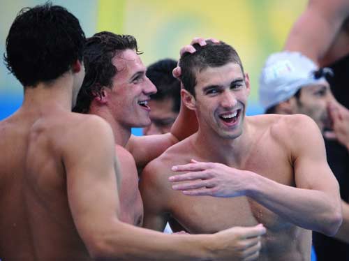 US swimmers Ricky Berens (L), Michael Phelps (R) and Ryan Lochte celebrate after winning the men's 4 x 200m freestyle relay swimming final at the National Aquatics Center during the 2008 Beijing Olympic Games in Beijing on August 13, 2008. A US team led by superstar Michael Phelps broke the men's 4x200m freestyle relay world record Wednesday with a time of 6min 58.56sec.[Agencies]