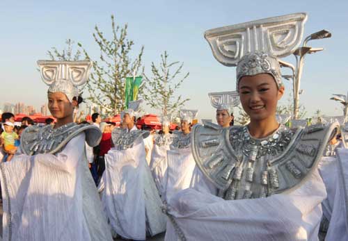 Dancers perform around the Olympic Green, north of Beijing on August 22, 2008. Performances brought by artists home and abroad have been staged in the Olympic Green during the Beijing Games. [Xinhua]