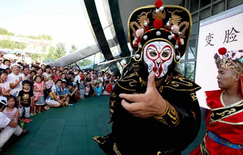An Sichuan opera actor performs "face-changing" stunt around the Olympic Green north of Beijing on August 22, 2008. Performances brought by artists home and abroad have been staged in the Olympic Green during the Beijing Games. [Xinhua]