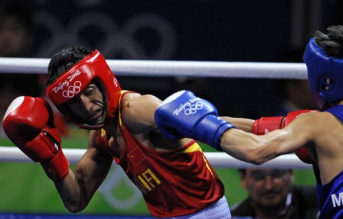 China's Shiming Zou (L) fights against Mongolia's Serdamba Purevdorj during their Beijing 2008 Olympic Games Light Flyweight (48 kg) final boxing bout on August 24, 2008 in Beijing.[Agencies]