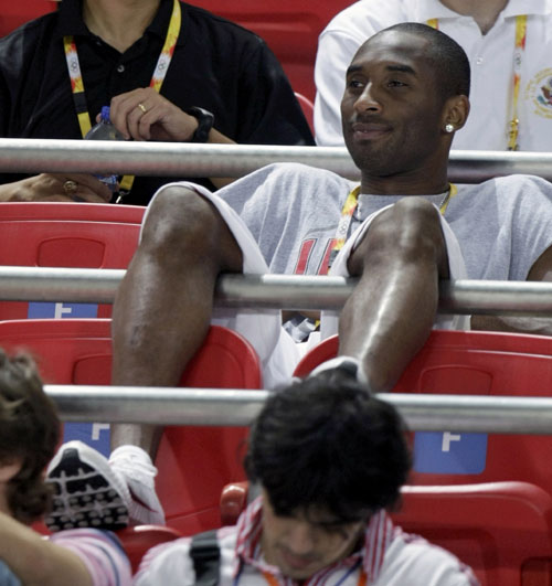 Los Angeles Lakers player Kobe Bryant of the U.S. watches the men's Group A first round soccer match between Serbia and Argentina at the Beijing 2008 Olympic Games August 13, 2008.[Agencies]