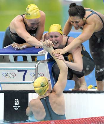 (L-R) Kylie Palmer, Bronte Barratt, Stephanie Rice and Linda Mackenzie (bottom) of Australia celebrate after winning the women's 4x200m freestyle relay final at the National Aquatics Center during the Beijing 2008 Olympic Games August 14, 2008.[Agencies]